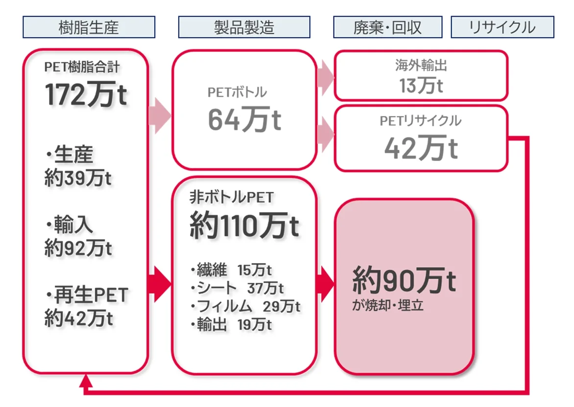 多くの製品は、 混紡繊維や複合フィルムなど“複合PET”で、従来のリサイクル方法は適用が困難 でした。そのため、繊維やフィルムなどの非ボトル系PETのリサイクル率の低さが課題となっています。
