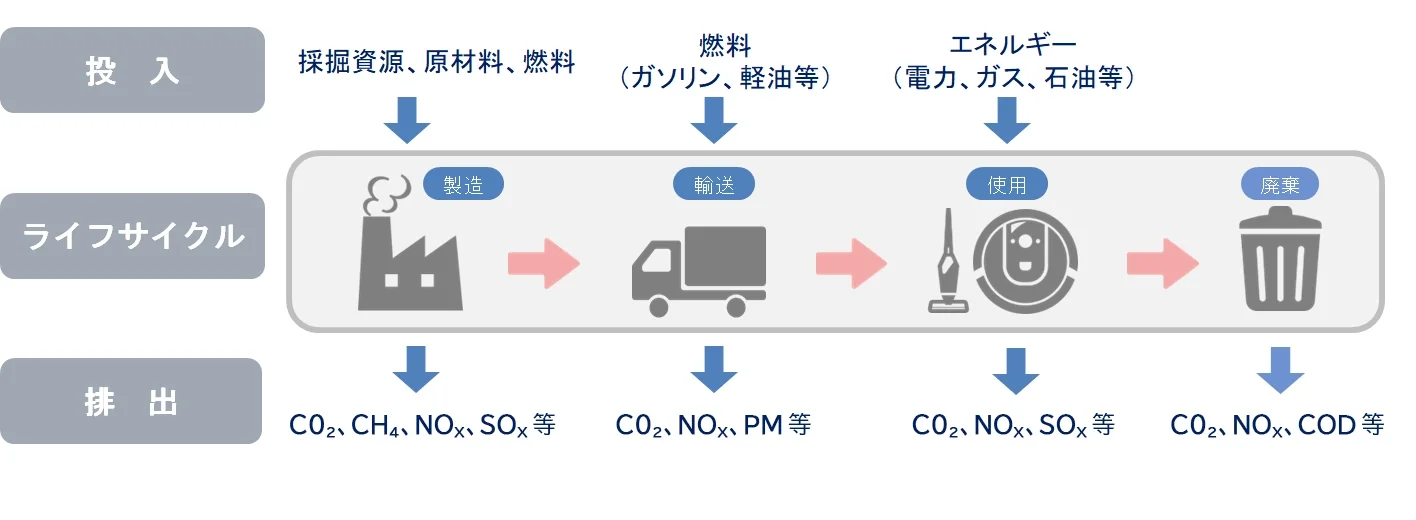 製品が作られる過程から使われる過程、廃棄される過程に至るまでの過程のなかで、資源の使用やエネルギー消費などによる環境負荷(CO₂,HFC等のGHG排出量、NOx,SOx等、資源消費など)がどの程度であるかを評価、分析する手法です。