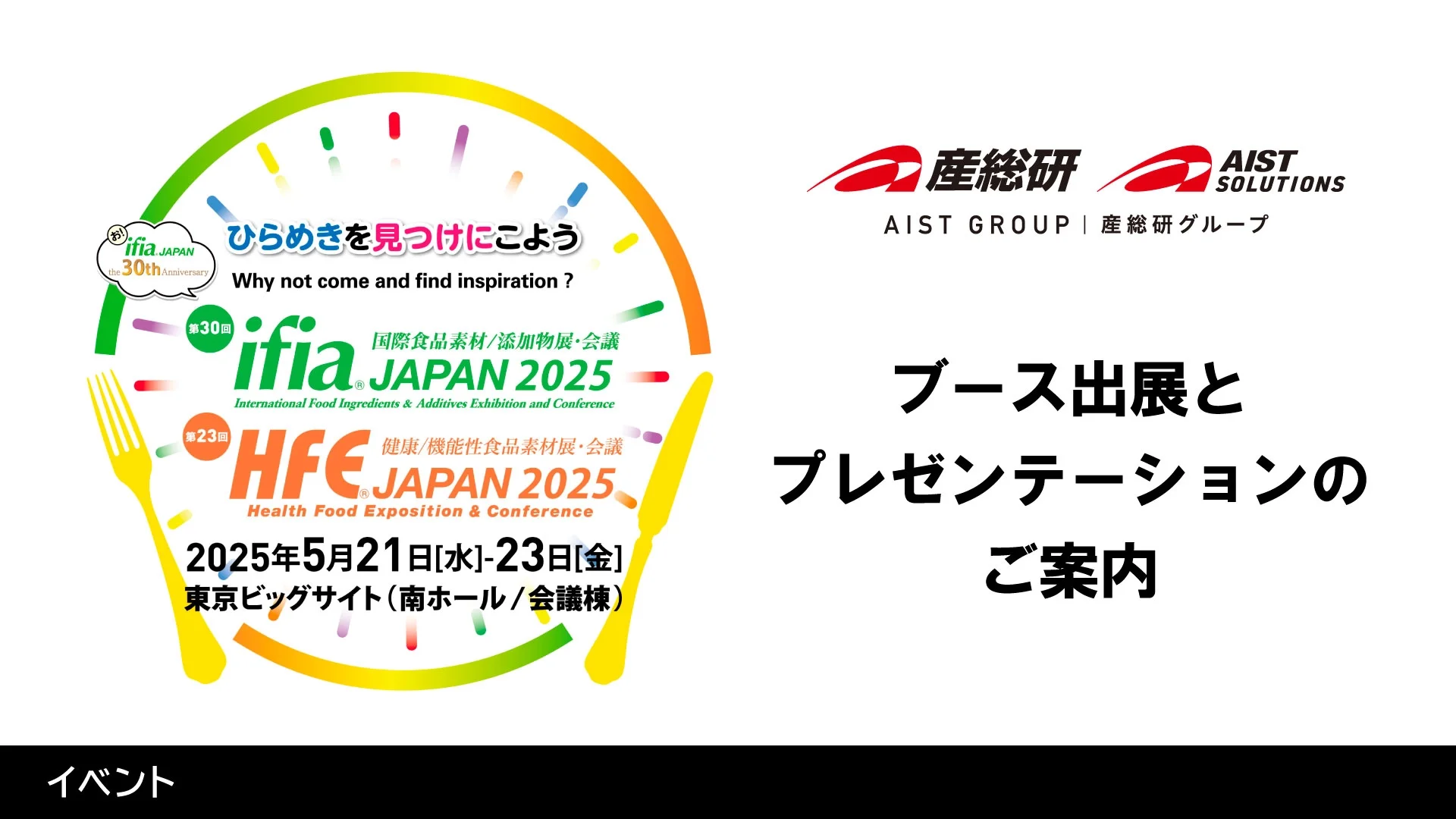 ifia JAPAN2025 [アイフィア・ジャパン]第30回国際食品素材/添加物展・会議 HFE JAPAN2025 [エイチエフイー・ジャパン]第23回健康/機能性食品素材展・会議に産業技術総合研究所 生命工学領域がブース出展(No.ゾーン3615)いたします。このブースでは食品関連研究に関する取組を4テーマご紹介します。