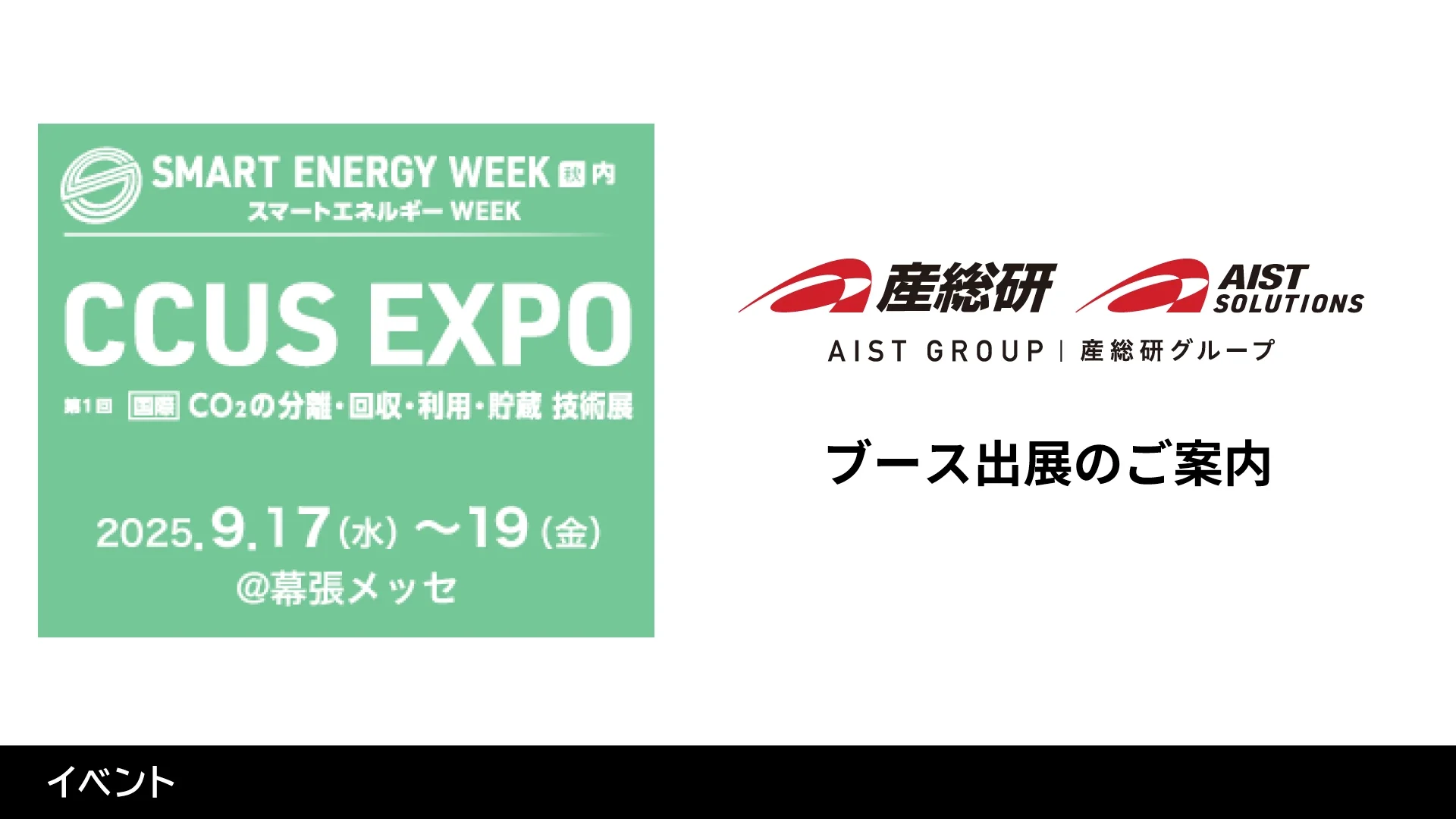 2025年9月17日(水曜日)~9月19日(金曜日)に開催される「 SMART ENERGY WEEK 秋2025 第1回 CCUS EXPO -CO 2 の分離・回収・利用・貯蔵 技術展- 」( ブース番号:E9―48(第5ホール) )に出展します。今夏、産総研グループではCO 2 分離素材評価センター(Japan Evaluation Center for CO 2 Capture Material, JEC 3 M)を設立しました。CO 2 分離素材の性能や特性を中立的かつ公平に評価することで、CO 2 分離素材技術の実用化を加速します。