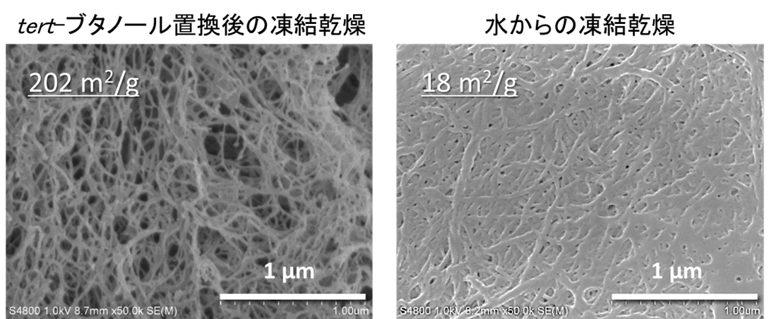■SEM(走査型電子顕微鏡)観察: 乾燥方法によって異なる市販CNFの形状観察