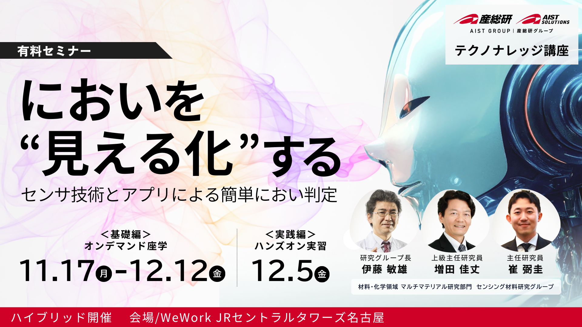 本講座では、においセンシング技術の基礎から、センサ素子と機械学習を活用したにおい判定アプリの使用方法まで、実践的に学んでいただけます。市販のセンサ素子と簡易な回路を使って、誰でもリアルタイムににおいを検出・分類する方法を体験できます。 また、産総研が取り組むにおいを新たなセンシング情報とする研究の最新事例も紹介し、ビジネス・研究の可能性を広げる実践的なプログラムをご体験いただけます。