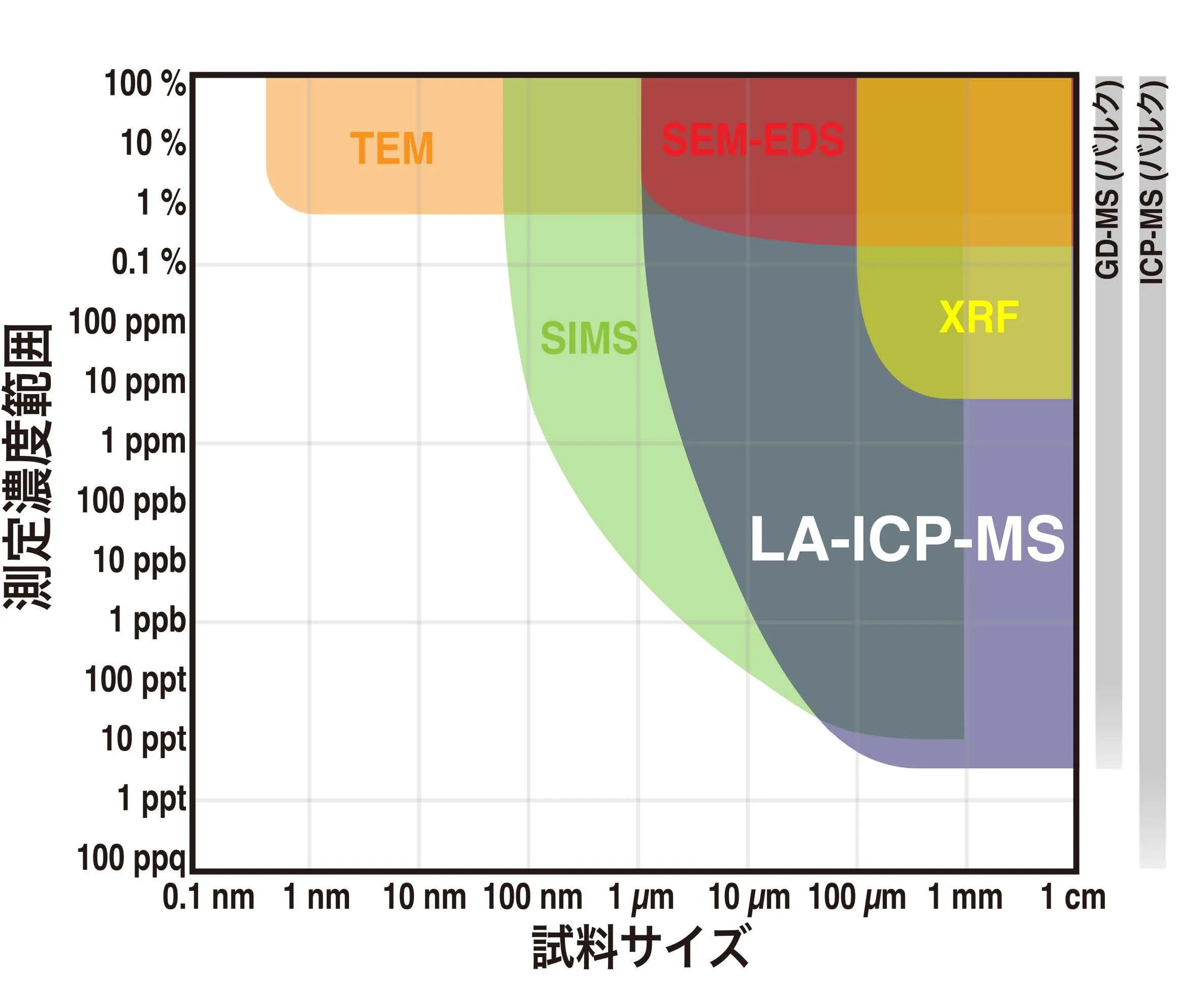 固体元素分析法における試料サイズと測定濃度範囲の比較