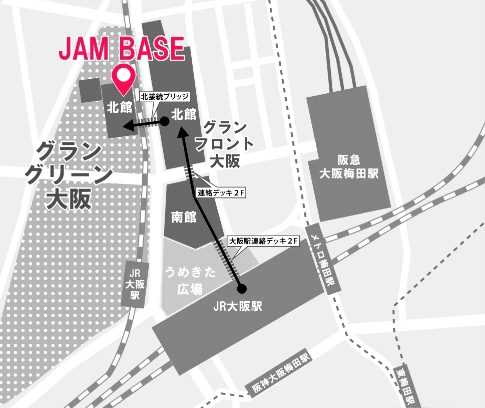 - グランフロント大阪 北館 から 接続ブリッジ で グラングリーン大阪 北館 JAM BASE へ渡ってください。