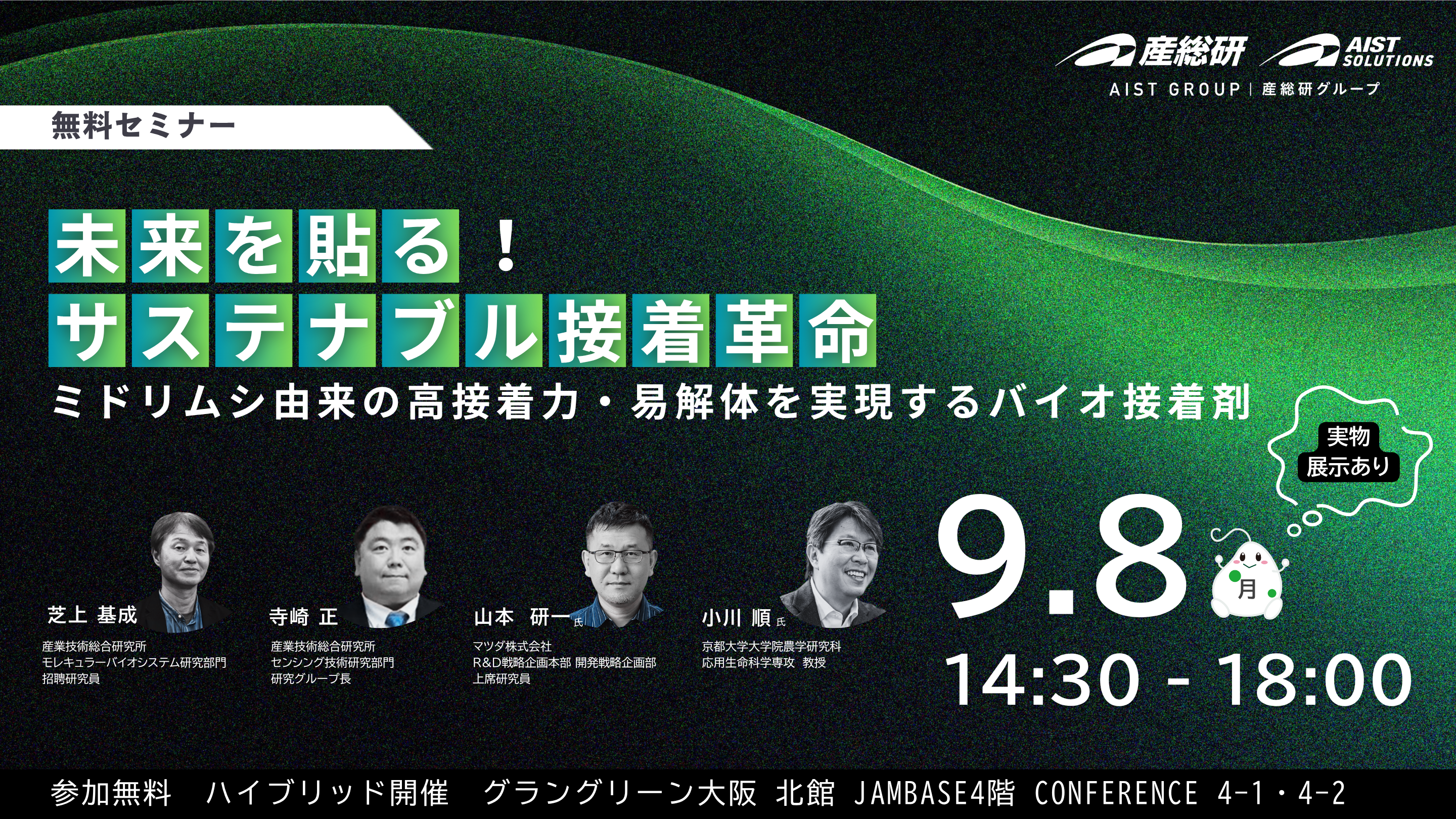 | 15:25~15:55 | 「 ミドリムシ接着剤 -高強度30MPaと易解体両立への挑戦、資源循環への礎として-」 | 産総研 センシング技術研究部門 製造センシング研究グループ 研究グループ長 | 寺崎 正 |