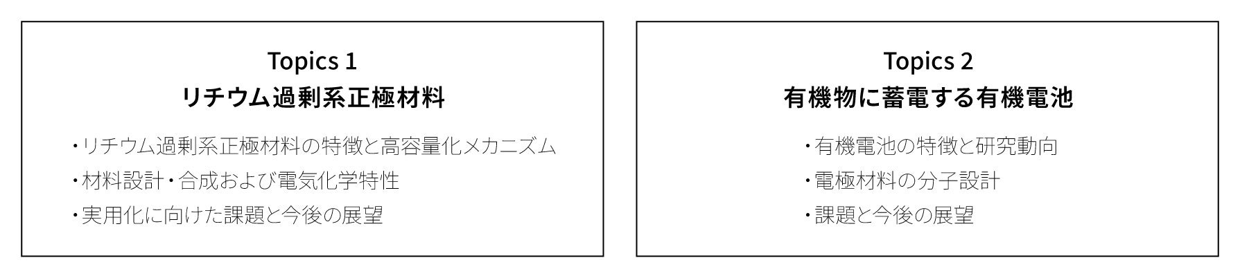 前半では、従来の正極材料を超える高容量化を実現する可能性を持つリチウム過剰系正極材料について、材料設計、反応メカニズム、性能向上に向けた研究動向を紹介します。後半では、金属資源への依存を低減し、軽量・柔軟な電池の実現につながる有機活物質を用いた次世代電池について、材料開発の考え方や最新の研究成果を解説します。