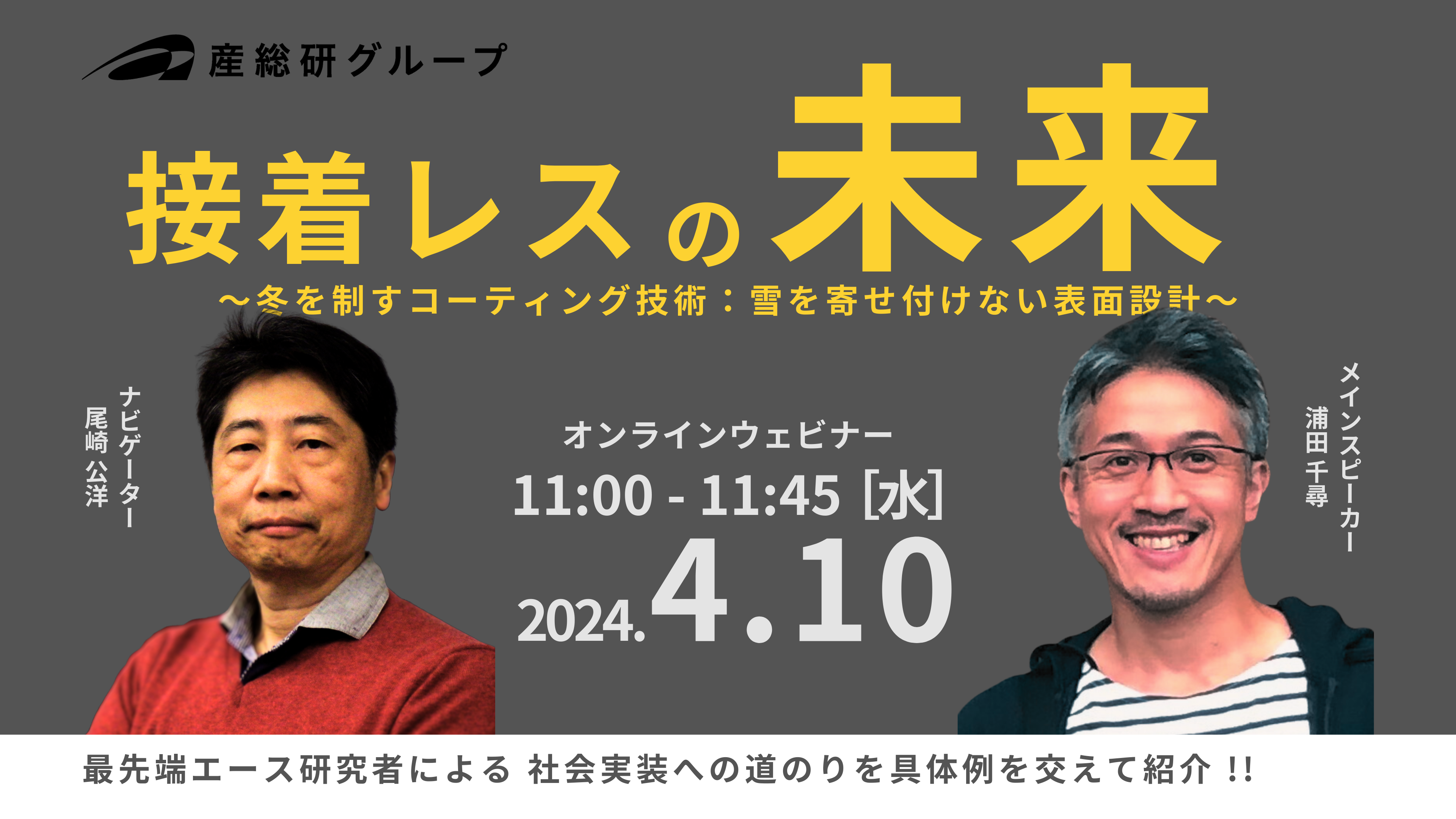 本ウェビナーでは、生物の表面機能に注目した撥水材料や、環境負荷低減を目指した有機フッ素化合物に依存しない表面処理技術を開発した極限機能材料研究部門の光熱制御材料グループの研究グループ長である浦田千尋さんをお迎えし、開発技術の紹介と具体的なユースケースを交えながら、雪が付着しない接着レスの未来実現に向けた可能性を探っていきます。