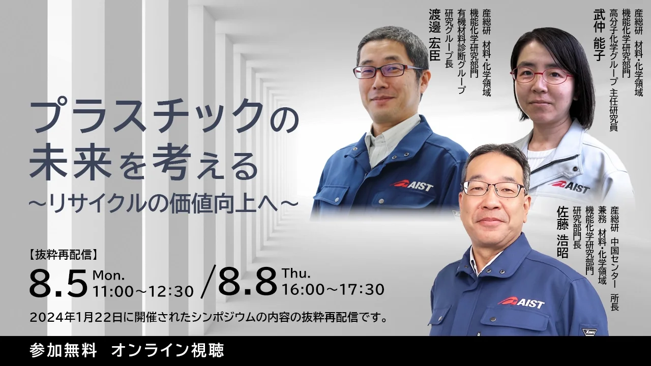 本シンポジウムでは、プラスチックリサイクルの未来を共に考える場として、国内外の動向、企業や産総研グループでの取り組みをご紹介します。 皆様との多面的なオープンイノベーションを通して、当該社会課題の解決が進展することを期待しております。