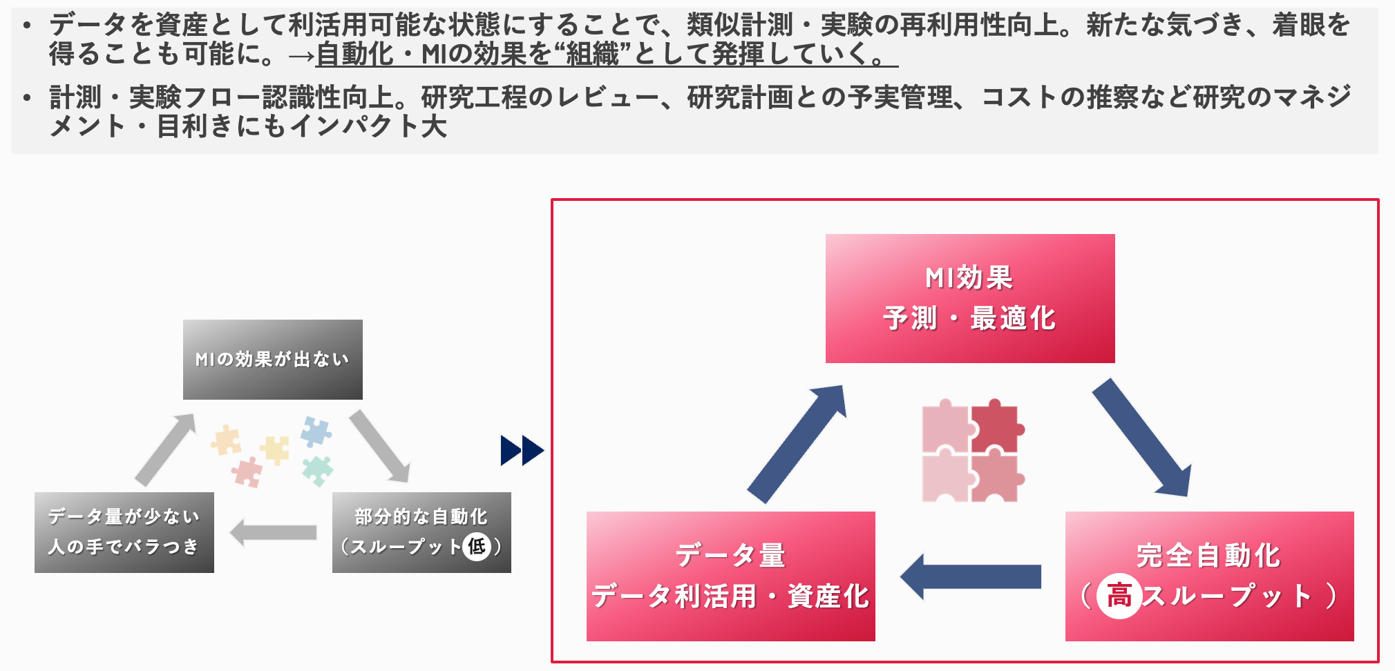 - MIを予算をつけて導入したが投資効果や成果をイマイチ実感できていない、“属人性”や“サイロ化”を課題と感じている研究企画担当者