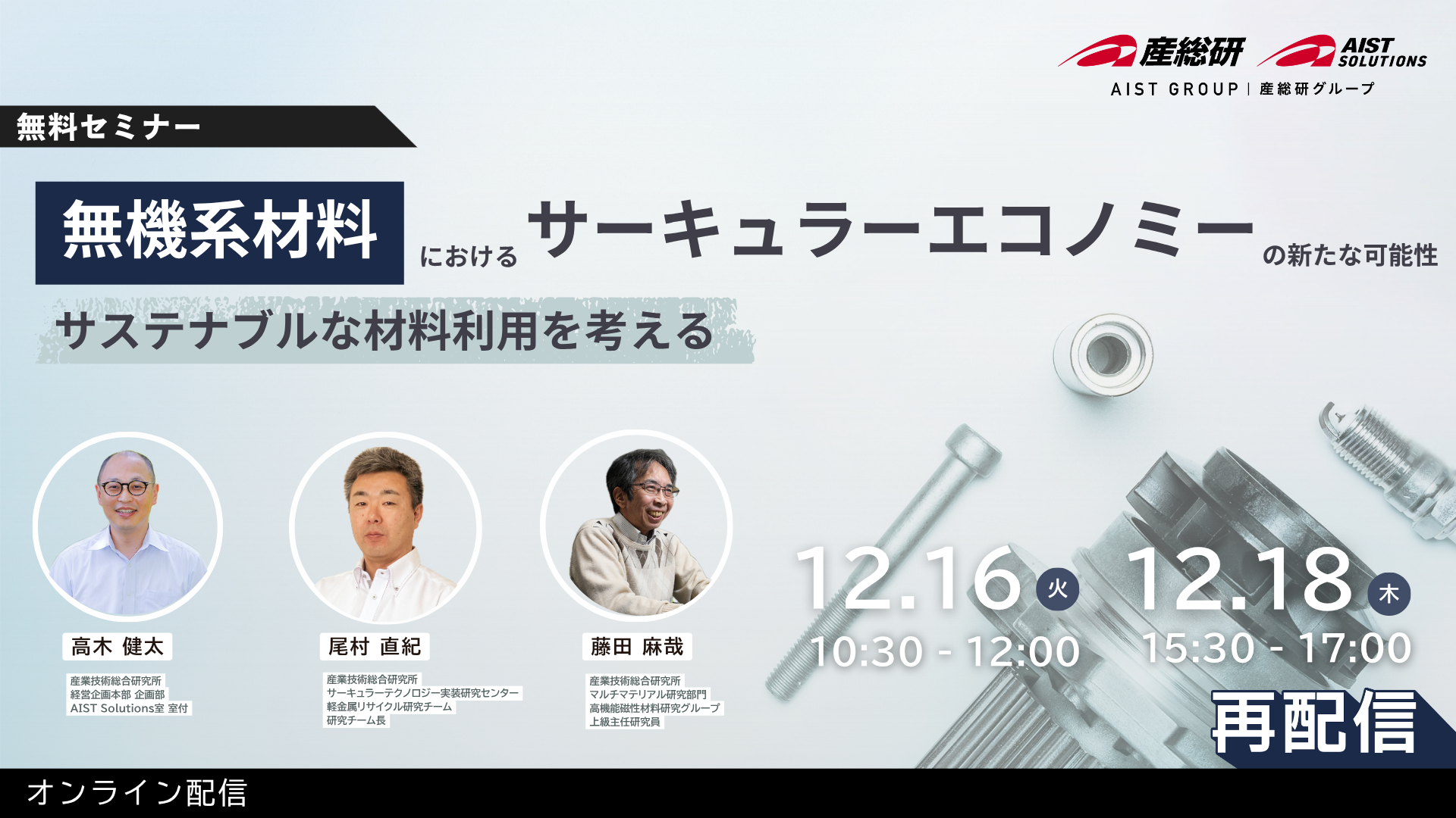 3月に開催し好評を博したセミナー「無機系材料におけるサーキュラーエコノミーの新たな可能性」を、収録再配信でお届けします。「アルミニウム」「モータ」「熱」の3分野に焦点を当て、アップグレードリサイクルを支える高純度化技術、モータ部品のリマニュファクチャリング、未利用熱の活用を拓く次世代材料・ヒートポンプ技術など、資源循環と省エネルギーに資する最先端の知見を凝縮。見逃した方のキャッチアップはもちろん、リサイクル/リユースの新技術探索、自社製品の資源循環・廃棄物削減、モータ用金属材料や「熱」関連の製品・材料開発に携わる方にも有用な内容となっています。ぜひこの機会にご視聴ください。