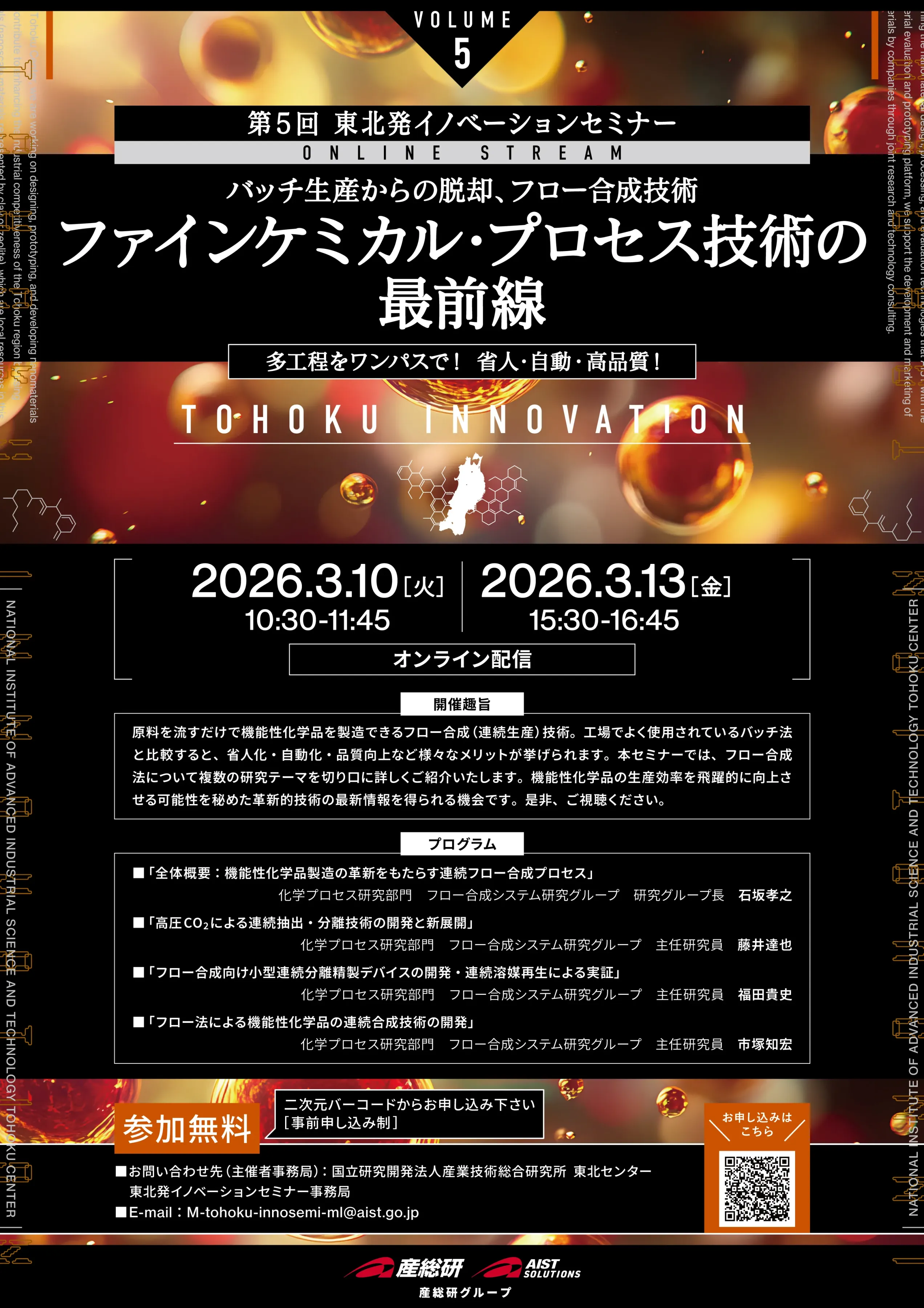 第5回東北発イノベーションセミナー(*)では、これらのメリットを持つフロー合成法について複数の研究テーマを切り口に詳しくご紹介いたします。機能性化学品の生産効率を飛躍的に向上させる可能性を秘めた革新的技術の最新情報を得られる機会です。是非、ご視聴ください。