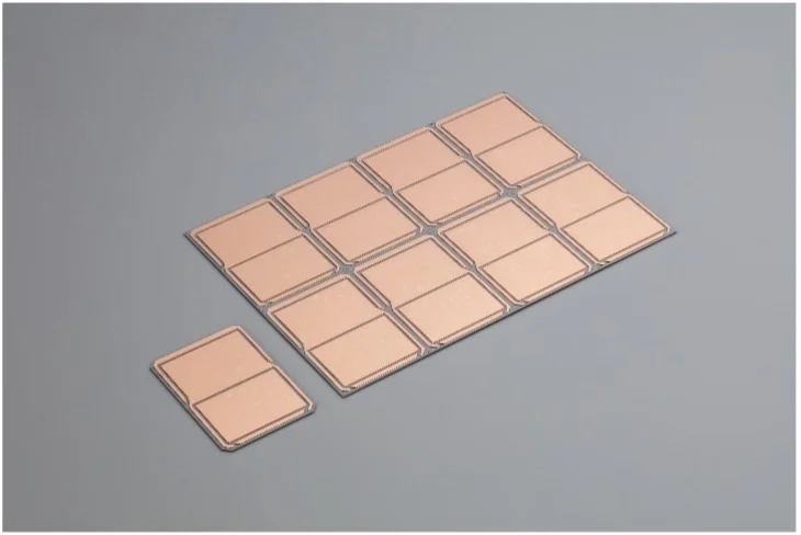 窒化ケイ素製セラミック基板と2枚の銅板で構成された基板。日本ガイシの絶縁放熱回路基板は、独自の高度な接合技術により、セラミック基板と銅板間の接合層がわずか数ミクロン以下の極薄構造となっています。これにより、接合層の熱抵抗の影響や内部のひずみを大きく低減させており、優れた放熱特性を実現しています。