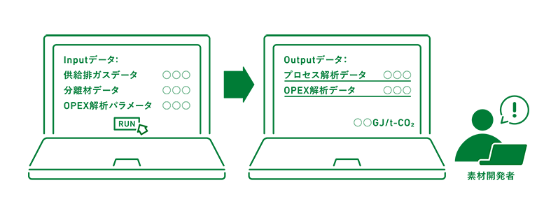 素材特性評価で測定したデータや、ユーザーが保有するデータを用いて、CO 2 分離回収技術のエネルギー消費量・コストを試算するための評価ツールを提供します。供給ガス組成・流量や、各CO 2 分離回収プロセスの操作条件を任意に設定し、エネルギー消費量・コストを比較することができます(図7)。