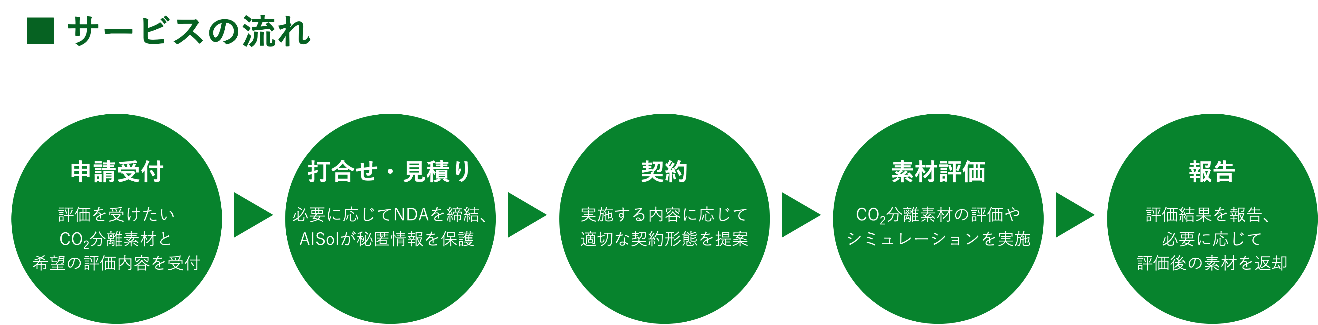 評価を受けたいCO 2 分離素材と希望の評価内容に基づき、AISolの担当者との打ち合わせを経て、最適な評価サービスを提案します。必要に応じて産総研の研究者も打ち合わせに参加します。契約締結後に評価を実施し、結果を報告します(図8)。