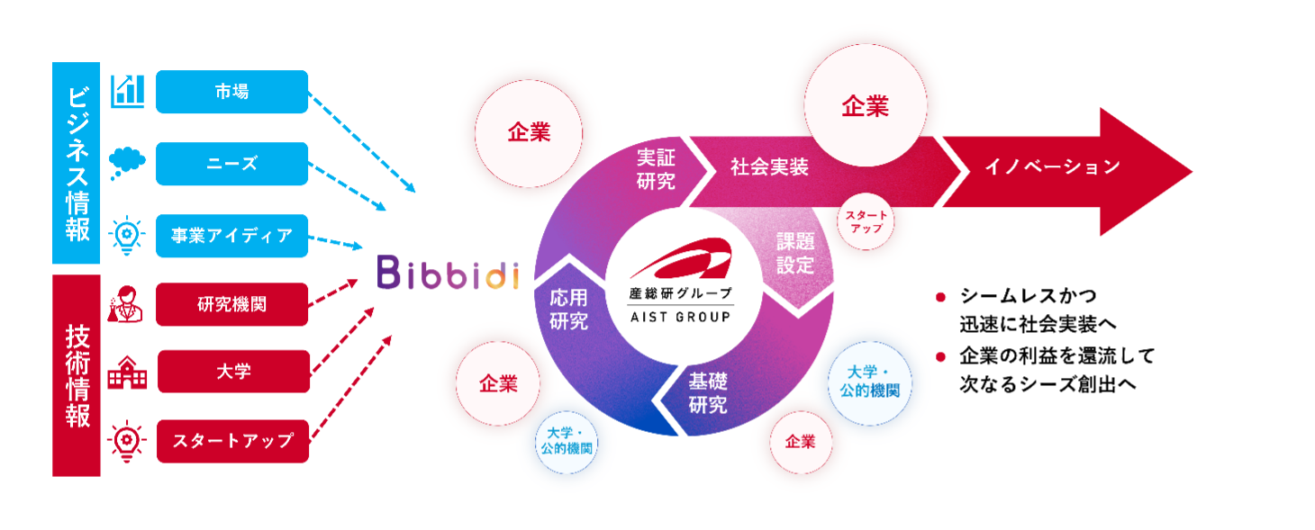 本取り組みは、新たに開発された生成AI「Bibbidi」の提供と産総研グループのコーディネートに関するノウハウを組み合わせた、前例のない産学連携でのオープンイノベーション支援サービスです。