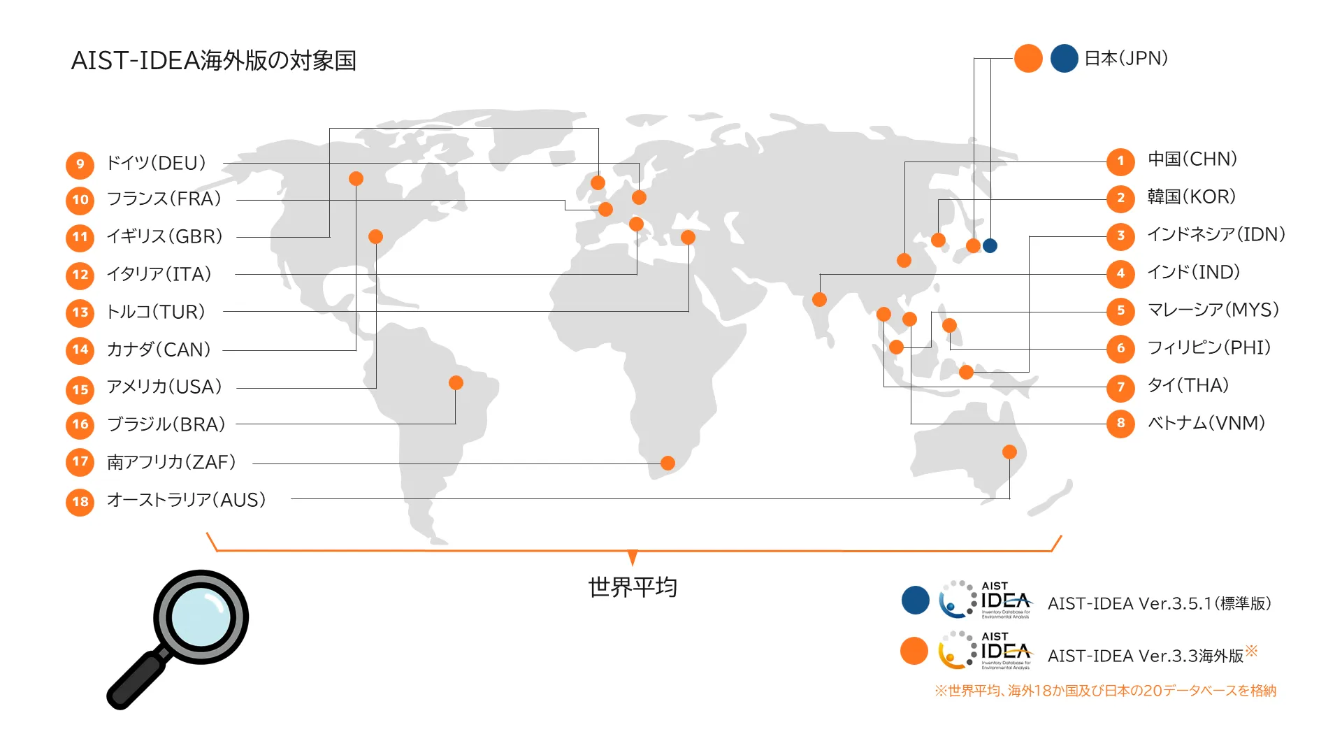 AIST-IDEA(アイストイデア)は、環境影響の見える化手法であるLCAやScope3を実施する際に必要となる排出原単位を、網羅性、代表性、完全性、透明性を担保しながら提供する世界最大規模のインベントリデータベースです。