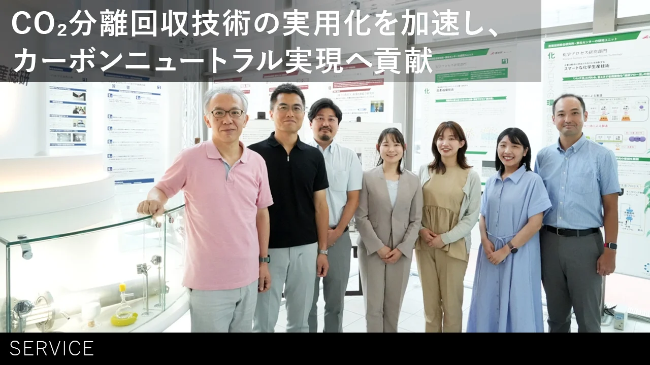 産総研グループは、CO₂分離素材(吸収液・吸着剤・分離膜)の素材特性・分離性能・耐久性に関する標準評価法および加速劣化試験法を開発するとともに、CO₂分離素材評価センター(JEC³M)を設立し、幅広い開発段階にある素材について客観的で信頼性の高い評価を行うサービスを提供しています。