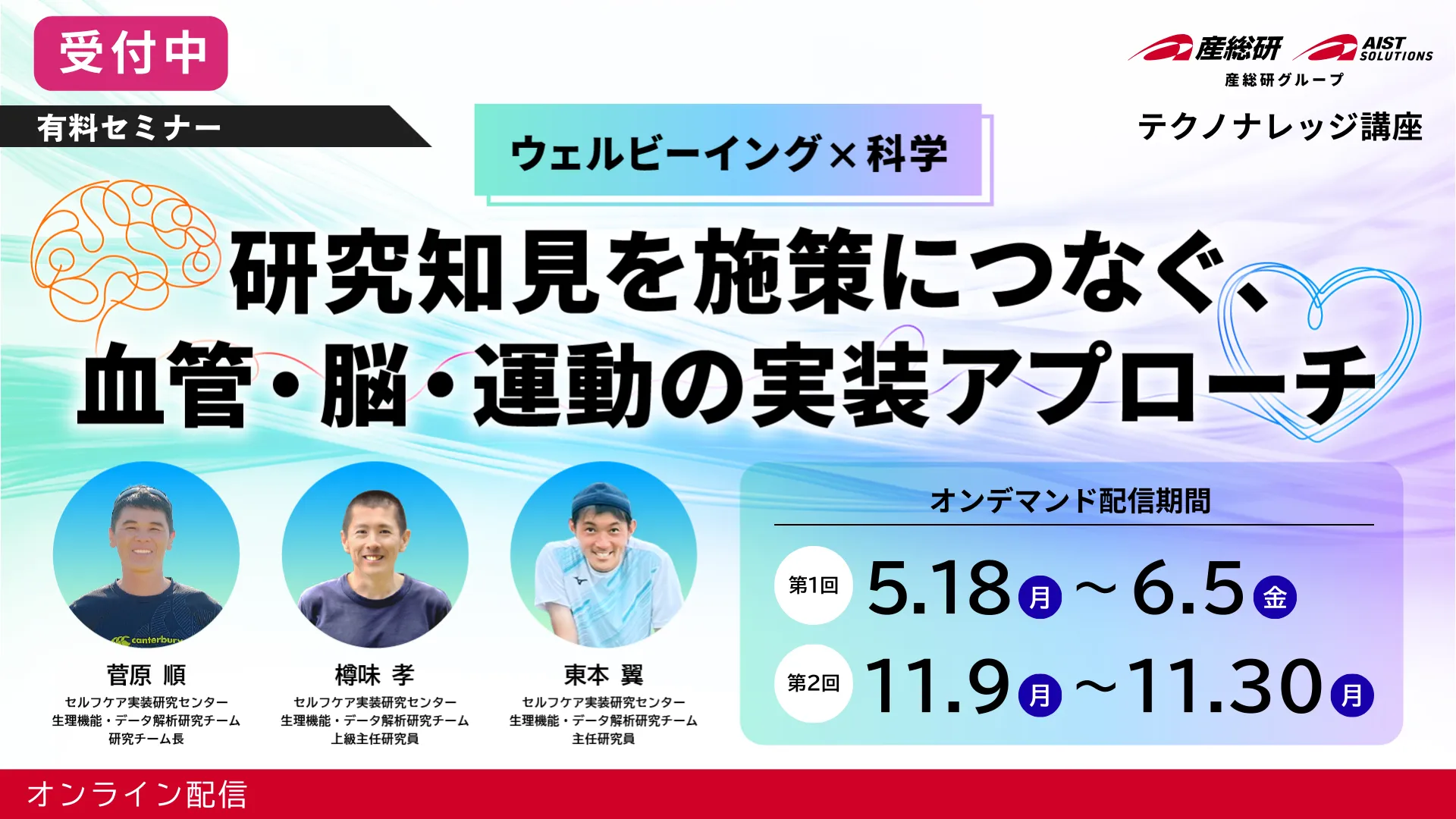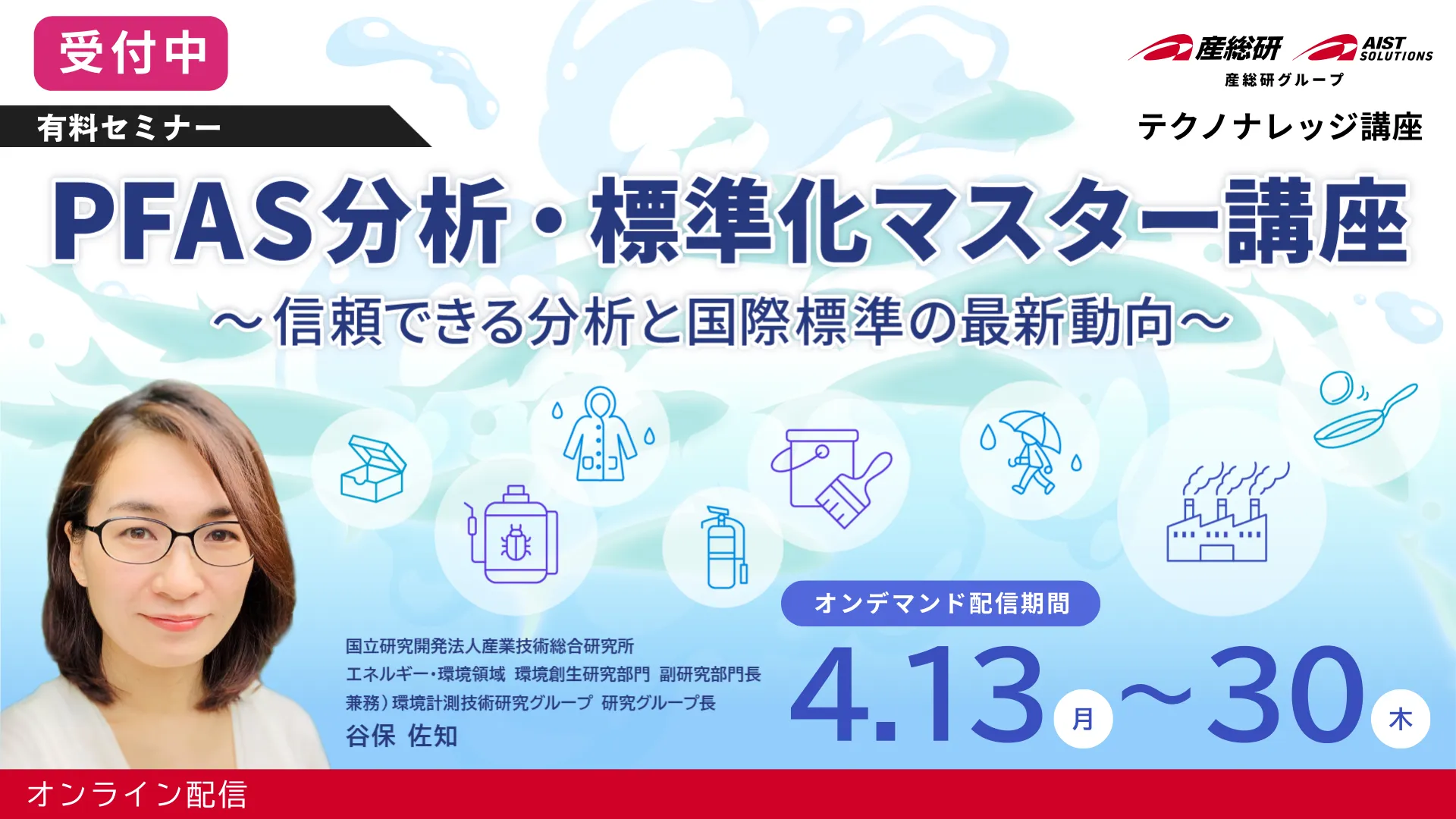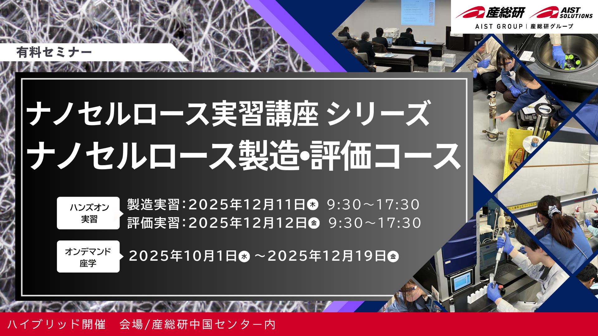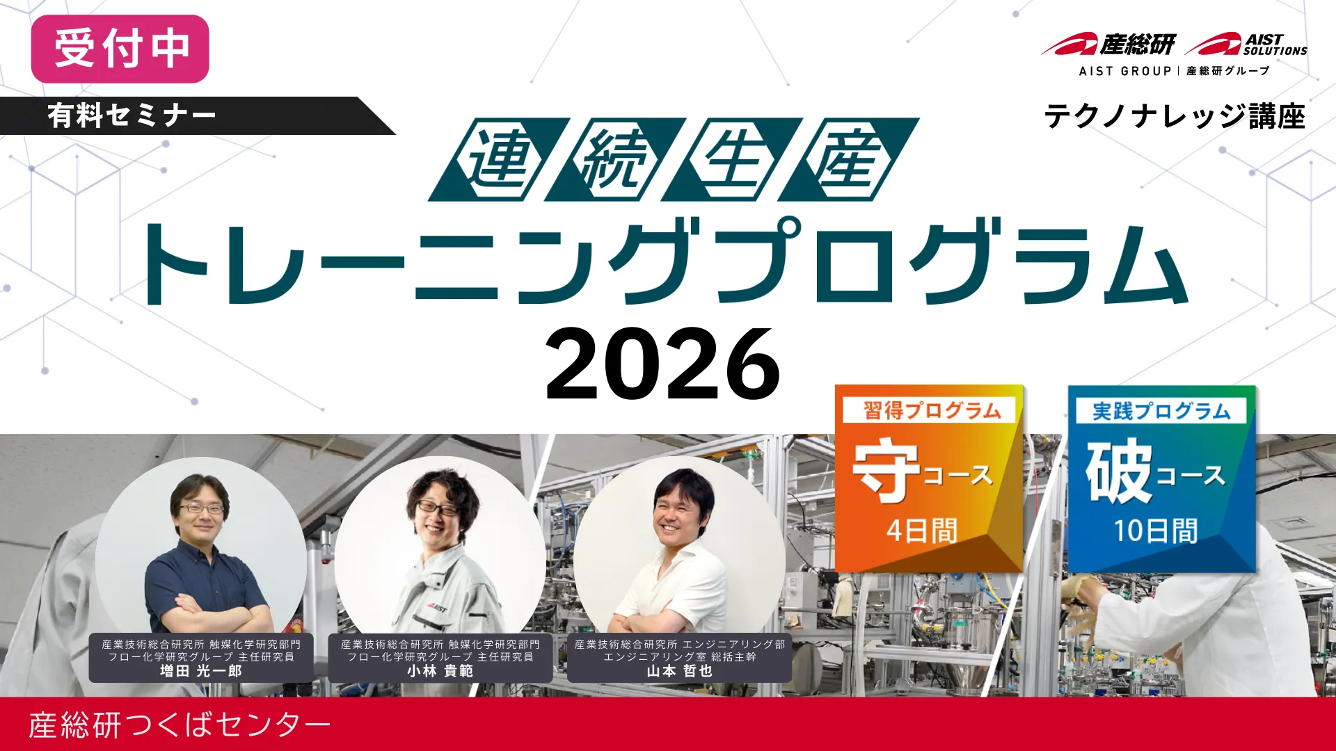 テクノナレッジ講座は、株式会社AIST Solutions(産総研グループ)が提供するサー ビスの一つで、企業の研究者やエンジニアが各産業分野の先端的な知見や技術を短期間で学習し現場で実践的に活かせることを目的にしています。講師陣は国内最大級の国立研究機関である産総研の精鋭研究者が担当し、オンラインあるいはオンサイト(産総研内)にて、1~3 日間で開催します。